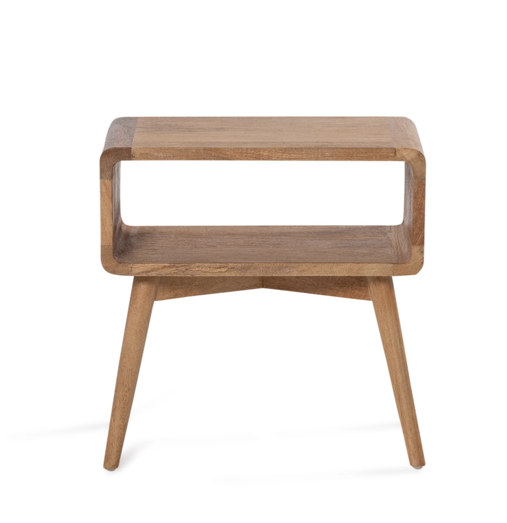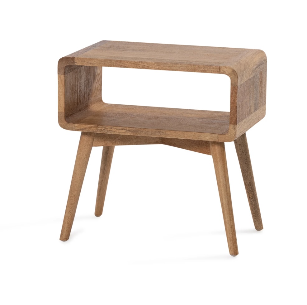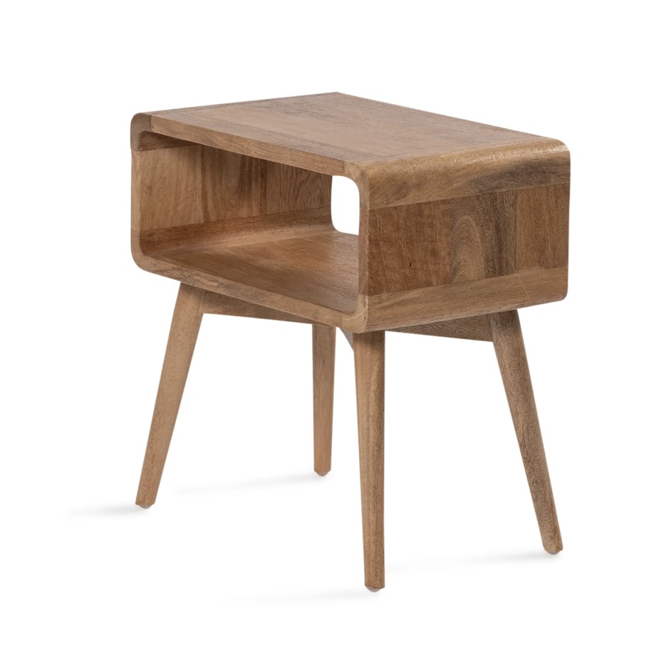 Crafted from solid mango wood, this side table blends clean lines, softly rounded rectangular form with an open cubby for easy storage or display, while tapered legs add a light, mid-century-inspired touch. Perfect as a bedside table, sofa side table, or accent piece in any living space. Each piece highlights the natural grain and variation of mango wood, making every table one of a kind.