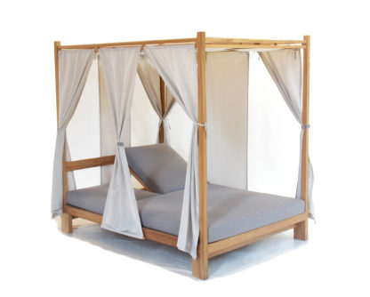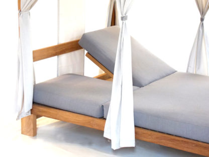 Grade A plantation teak wood Certified by the Forest Stewardship Council (FSC) use to build this double sun lounger. Spacious for couple or small family for relaxing by pool in this cabana like sun lounger. Cushion are include with Sunproof fabric. Curtains included.
